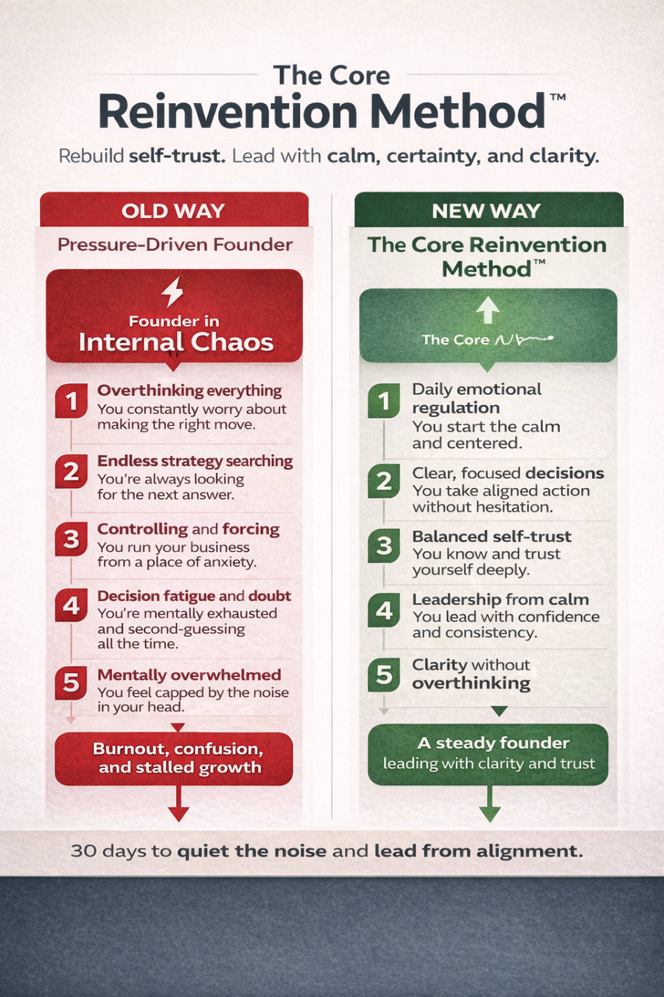 And as a result, this frees you up to lead your business with calm, certainty, and clarity instead of doubt and overthinking, so decisions feel lighter, execution becomes cleaner, and your company is no longer limited by your internal noise. This is the "Core Reinvention Method."